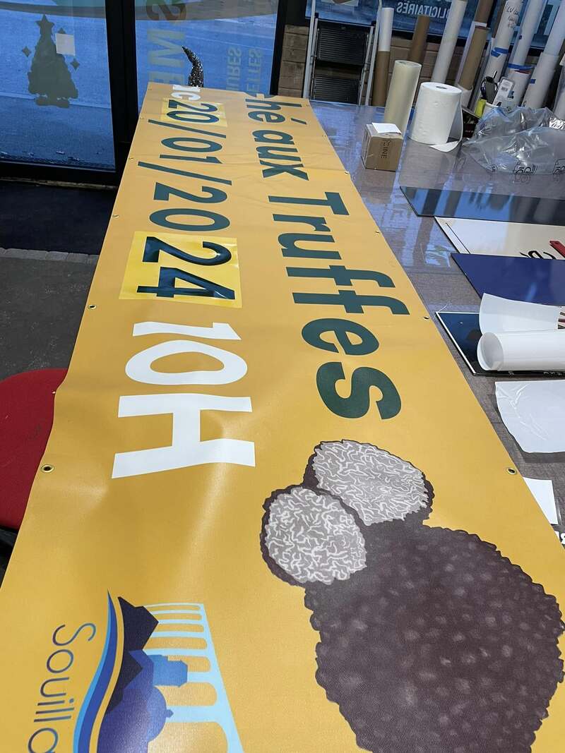 Bâche imprimée avec changement de dates en adhésifs